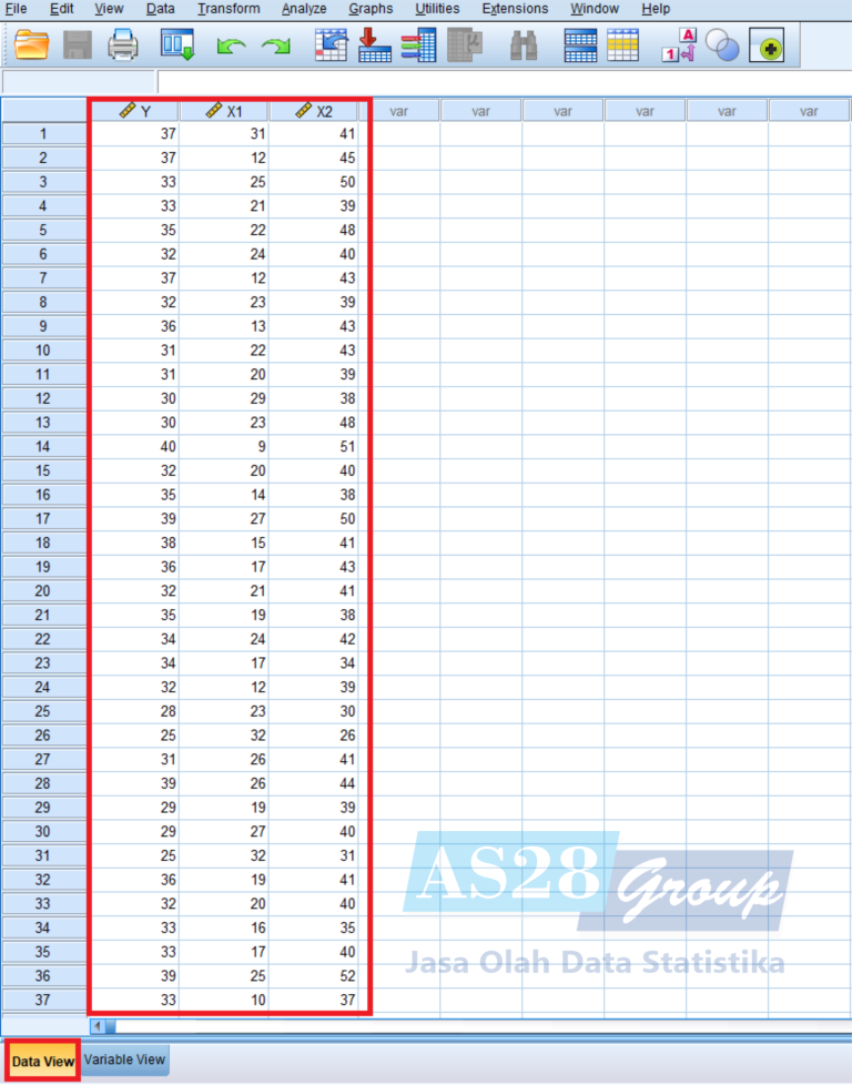 Siapkan tabulasi data di Excel, lalu input data atau masukan data ke SPSS pada Page Data View