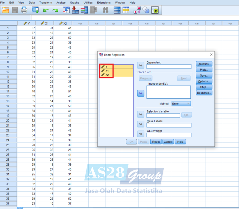 Masukan Variabel X (Independen) ke kolom Independent(s) dan variabel Y (Dependen) masukan ke kolom Dependent lalu pilih OK