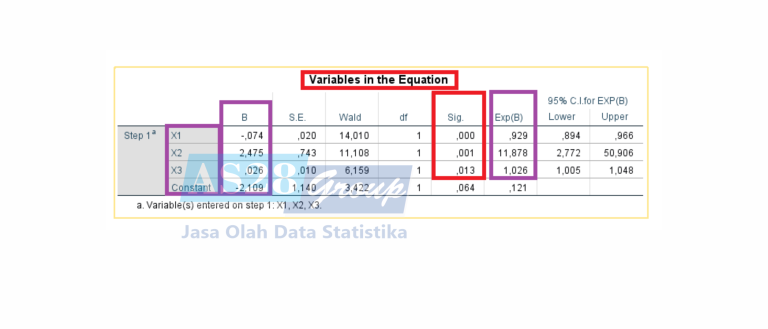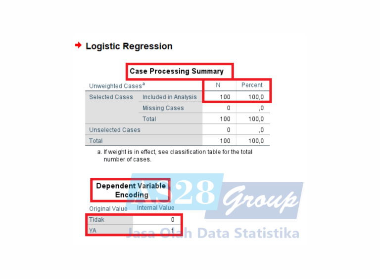 Pada tabel output ini (Case Processing Summary) cuma menjelaskan jumlah data atau N yang digunakan yaitu sebanyak 100 data atau N = 100. Sedangkan untuk tabel output (Dependent Variable Encoding) menjelaskan kategorisasi data pada variabel dependen, yaitu 0 = Tidak dan 1 = Ya.
