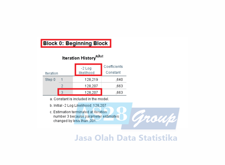 Tabel ini menjelaskan apakah model yang digunakan sebelum variabel independen masuk ke dalam model sudah/belum memenuhi syarat uji dalam regresi logistik. Nilai -2 Log Likelihood yang diperoleh sebesar 128,207 lebih besar dari Chi Square Tabel yang digunakan yaitu 123,225 maka bisa disimpulkan bahwa model sebelum dimasukki variabel independen masih tidak memenuhi syarat uji. Cara mencari Chi Square tabel dalam Output Iteration History di Block 0 yaitu N-1 (100-1 = 99) artinya Chi Square Tabel yang diperoleh sebesar 123,225.