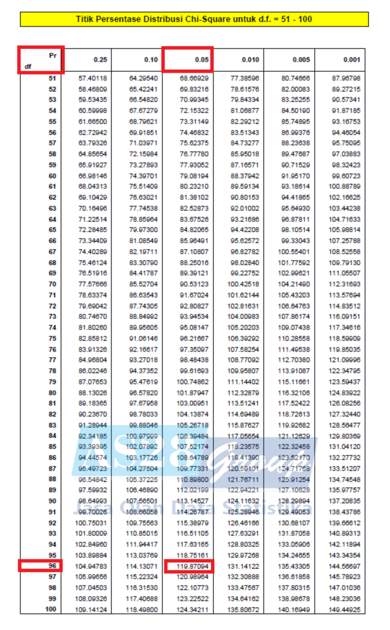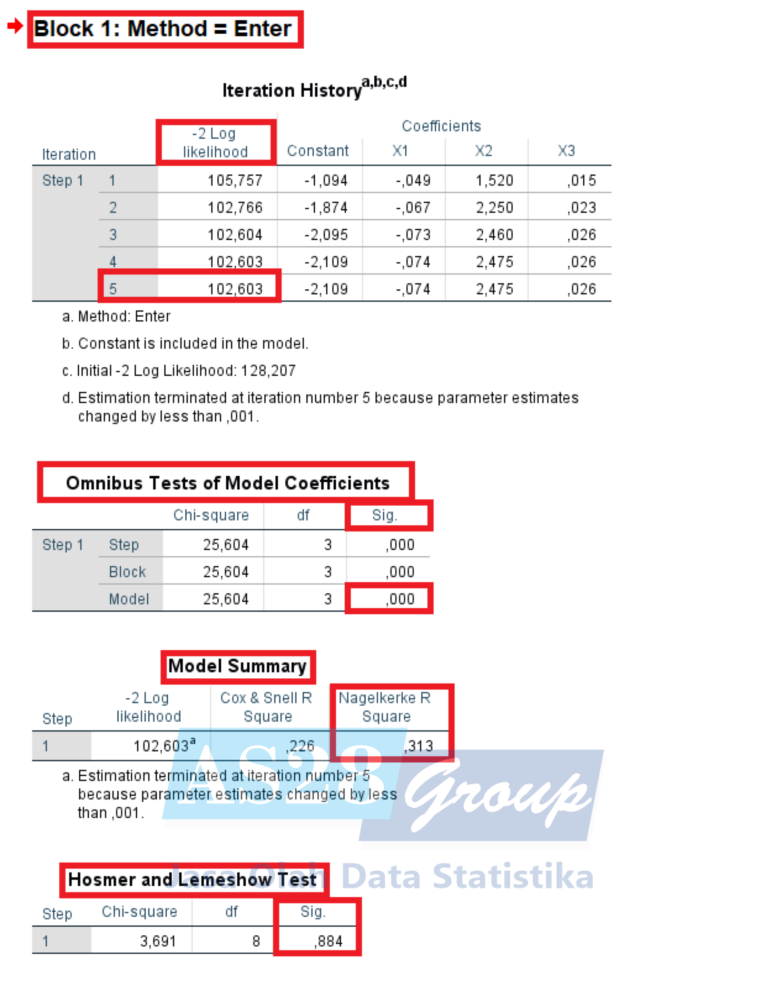 Tabel ini menjelaskan apakah model yang digunakan setelah variabel independen masuk ke dalam model sudah/belum memenuhi syarat uji dalam regresi logistik. Nilai -2 Log Likelihood yang diperoleh sebesar 102,603 kurang dari dari Chi Square Tabel yang digunakan yaitu 119,870 maka bisa disimpulkan bahwa model setelah dimasukki variabel independen sudah memenuhi syarat uji. Cara mencari Chi Square tabel dalam Output Iteration History di Block 1 yaitu N-K-1 (100-3-1 = 96) artinya Chi Square Tabel yang diperoleh sebesar 119,870.