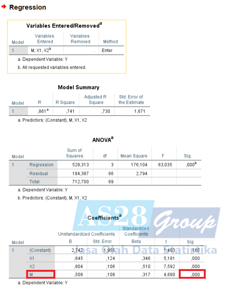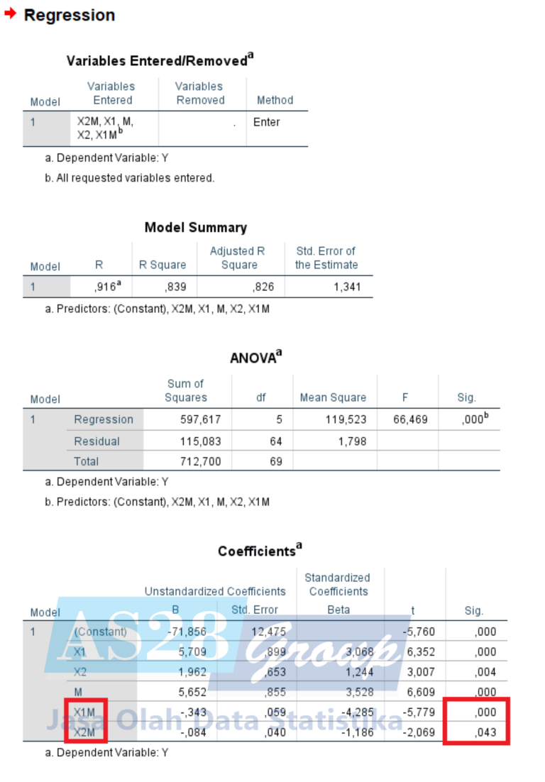 Pada output kedua ini kawan-kawan semua bisa fokus pada tabel Coefficient, lebih tepatnya pada Nilai Koefisien Regresi (B) dan Nilai Signifikansi. Nilai Signifikansi Variabel X1, X2 dan M yang diperoleh sebesar 0,000 (<0,05) berkesimpulan bahwa variabel independen dan variabel moderasi berpengaruh signifikan terhadap variabel dependen secara parsial atau tersendiri. Persamaan Model Regresi yang di peroleh :