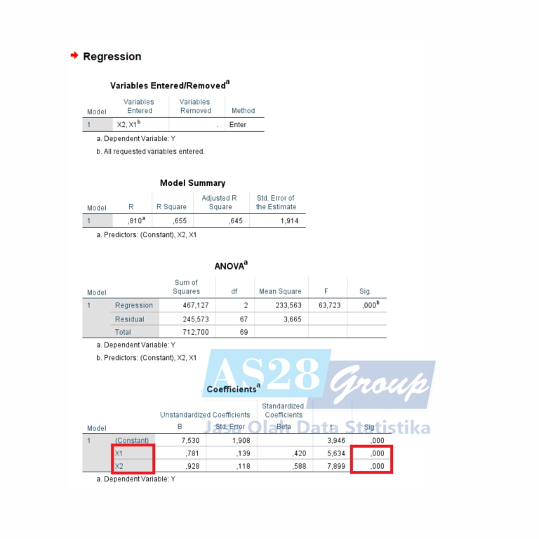 Pada output ini kawan-kawan semua bisa fokus pada tabel Coefficient, lebih tepatnya pada Nilai Koefisien Regresi (B) dan Nilai Signifikansi. Nilai Signifikansi Variabel X1 dan X2 yang diperoleh sebesar 0,000 (<0,05) berkesimpulan bahwa variabel independen berpengaruh signifikan terhadap variabel dependen secara parsial atau tersendiri. Persamaan Model Regresi yang di peroleh :
