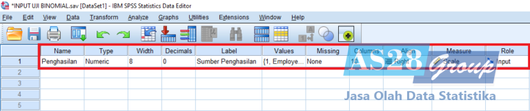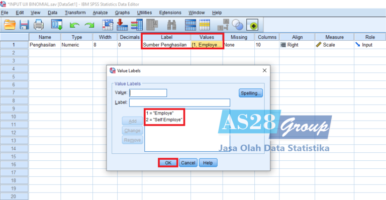 Lalu isikan Value Label, di mana Value 1 memiliki keterangan Employee dan Value 2 berketerangan Self Employee lalu pilih OK. Maka data yang digunakan dalam Uji Binomial ini yaitu data nominal.