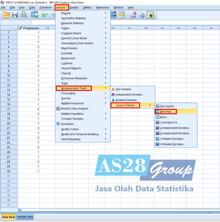Selanjutnya melakukan Uji Binomial, dengan cara pilih Analyze – Nonparametric Test – Legacy Dialog – Binomial.