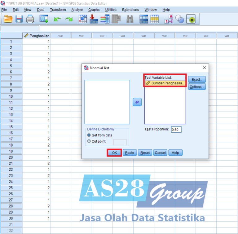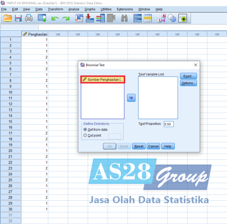 Masukan Variabel Sumber Penghasilan ke kolom Test Variable List dengan Test Proportionsebesar 0.50 dan yang terakhir pilih OK.