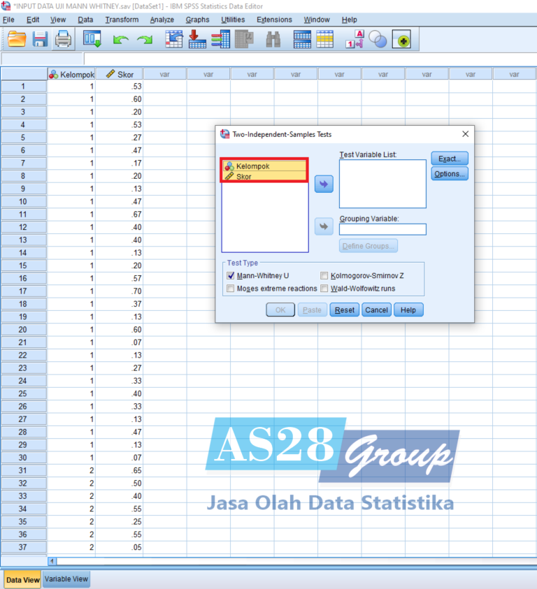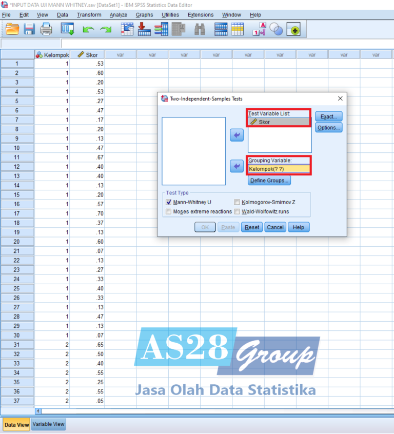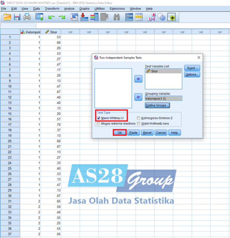 • Ceklis Mann Whitney U di bagian Test Type, lalu pilih OK.
