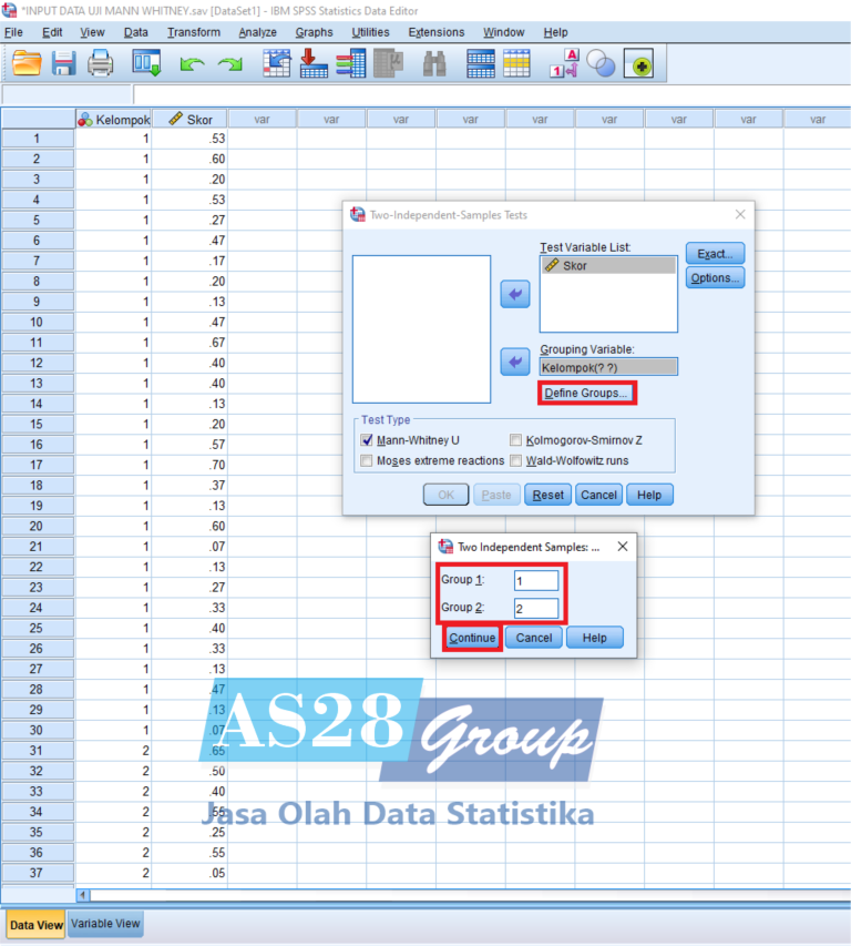• Selanjutnya pilih Define Group, isikan Group 1 dengan angka 1 dan Group 2 dengan angka 2, dikarenakan ada 2 kelompok yang digunakan, dan yang terakhir pilih Continue & OK.