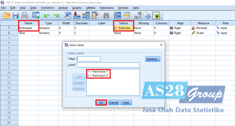 • Isikan juga pada Value Label di Variabel Kelompok. Value 1 untuk Kelompok 1 dan Value 2 untuk Kelompok 2, lalu pilih OK.