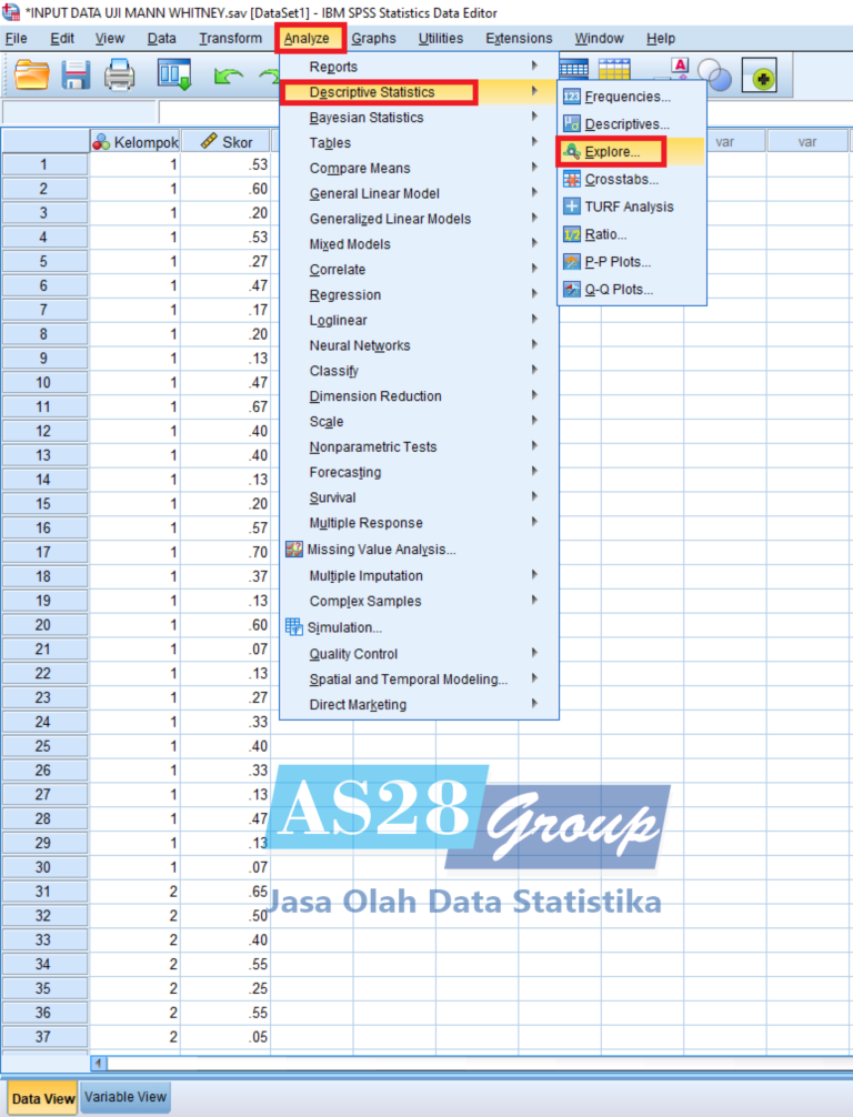 • Berhubung data yang digunakan merupakan data kuantitatif (rasio/interval) maka dilakukan uji normalitas. Tapi jika data yang digunakan merupakan data kualitatif (ordinal) maka bisa langsung ke Uji Mann Whitney. Langsung saja kita lakukan analisis Uji Normalitas, dengan cara pilih Analyze – Descriptive Statistics – Explore.