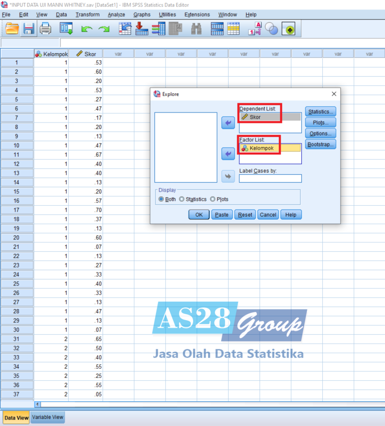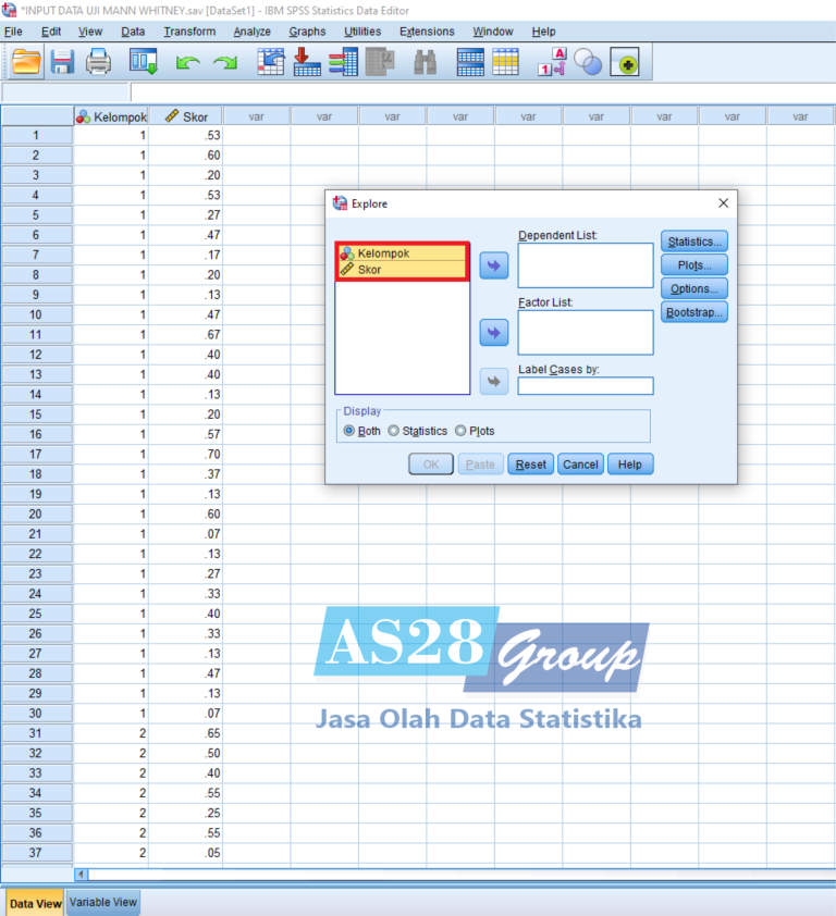 • Masukan Variabel Skor ke kolom Dependent List dan Kelompok ke Factor List.