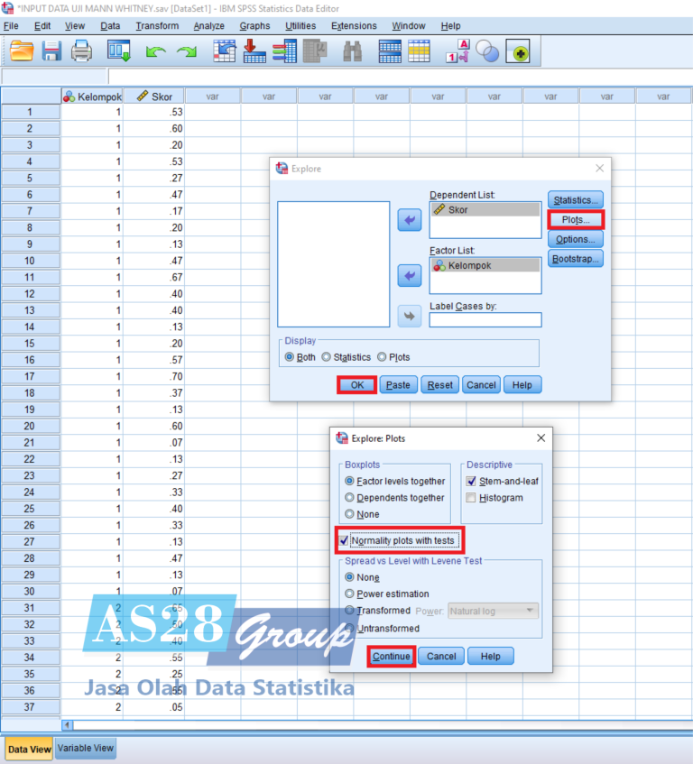 • Selanjutnya pilih Plots, Ceklis Normality Plots With Test lalu pilih Continue dan OK.