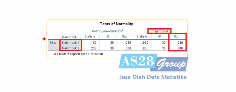 Diketahui nilai Sig. Shapiro Wilk Variabel Kelompok 1 sebesar 0.049 (<0.05) dan nilai Sig. Shapiro Wilk Variabel Kelompok 2 sebesar 0.000 (<0.05) maka bisa disimpulkan bahwa data yang digunakan (Kelompok 1 dan 2) tidak berdistribusi normal dengan kata lain asumsi uji normalitas tidak terpenuhi. Penggunaan uji normalitas shapiro wilk dikarenakan jumlah data yang dipakai kurang dari 50 (<50). Setelah mengeathui bahwasanya asumsi normalitas data tidak terpenuhi, maka bisa lanjut ke Uji Mann Whitney