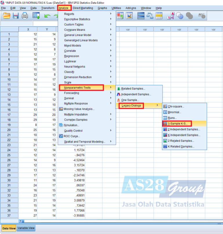 Selanjutnya baru kita melakukan analisis uji normalitas kolmogorov smirnov, dengan cara pilih menu Analyze – Nonparametric Tests – Legacy Dialogs – 1-Sample K-S