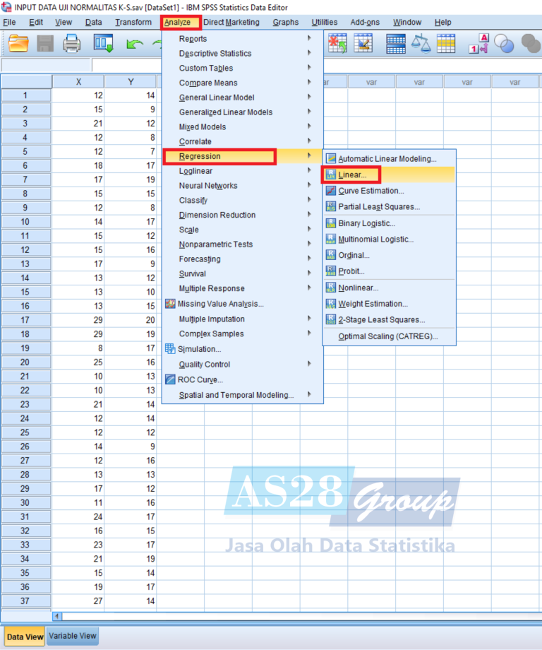 Selanjutnya lakukan analisis data, dengan cara pilih menu Analyze – Regression –Linear