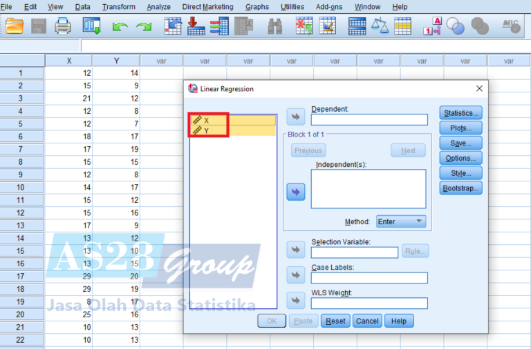 Masukan Variabel X (Independen) ke kolom Independent dan variabel Y (Dependen) masukan ke kolom Dependent – lalu pilih Save.