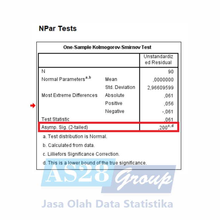 Diketahui nilai Asymp. Sig.(2-tailed) sebesar 0,200 (>0,05) maka bisa ditarik kesimpulan bahwa asumsi normalitas data telah terpenuhi, dengan kata lain uji normalitas sudah lolos. Data dinyatakan normal jika nilai Asymp. Sig. atau P-Value lebih besar dari 0,05 (Alpha 5%).