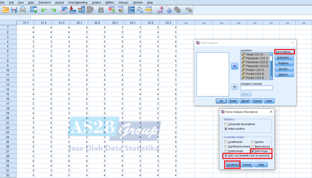 Lalu pilih Descriptives – Ceklis KMO and Bartlett’s test of sphericity dan Anti-image – lalu pilih Continue.